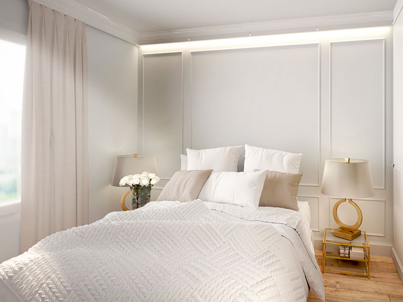 Se pican los suelos, que presentaban varias capas de baldosa superpuesta y se nivelan; se alisa el gotelé, se sustituyen los antiguos rodapiés por un modelo estilo francés de 20 cm, se demuele algún tabique para crear un dormitorio con vestidor; se sustituyen puertas y ventanas; se crean nuevos armarios y se diseña un hall con mueble de obra; se proyecta una cocina con doble poyete y balda de madera; se reforma completamente el baño con una estética elegante y limpia. Se proyecta un salón luminoso, con molduras en paredes y techo que ayudan a diferencias sus distintas zonas y se dispone iluminación indirecta para aportar un ambiente relajado y discreto.